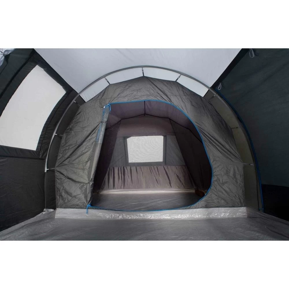 Naast de grote ingang aan de voorkant kan de tent ook via de rechter zij-ingang benaderd worden. Deze zijdeur is voorzien van een horrengaasdeur en de transparante ramen zijn voorzien van gordijnen die alles lekker donker maken.