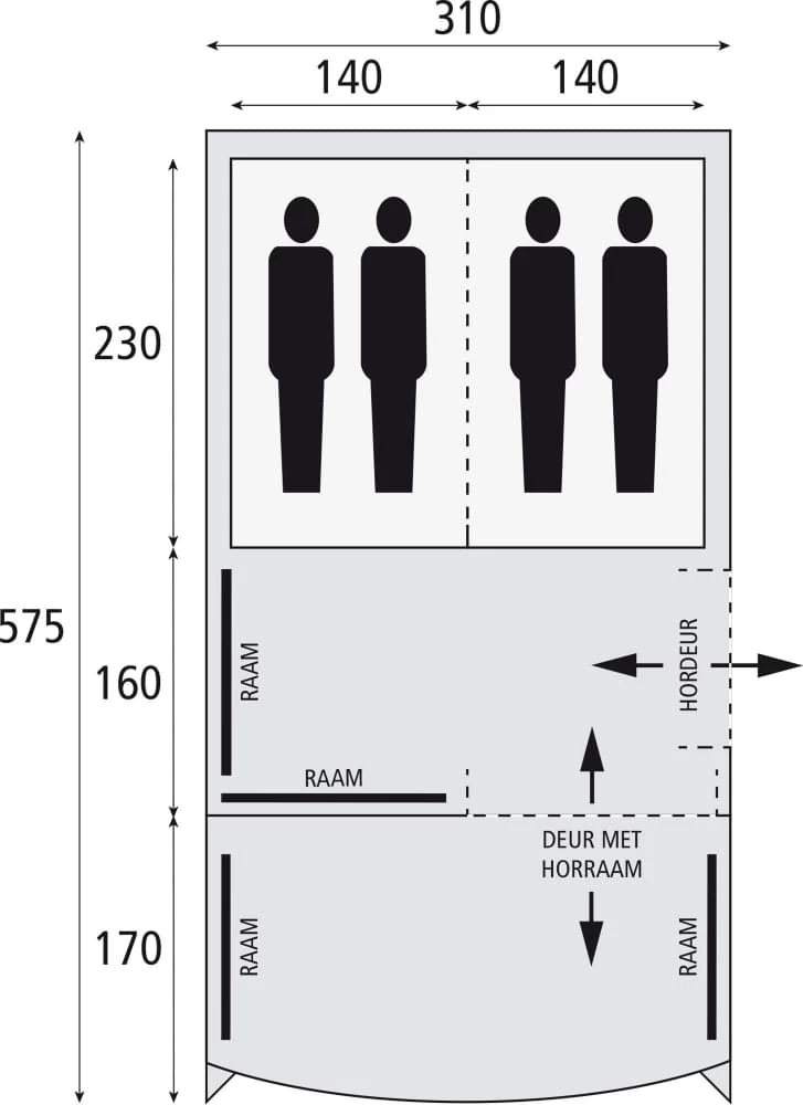 De slaapcabines zijn opgedeeld in 2 aparte ruimtes van beide 140 cm breed en deze kan door een scheidingswand met rits makkelijk open en dicht geritst worden. Deze beide slaapcabines bevatten horrengaas in beide toegangsdeuren. De voor- en zijdeur zijn ook met een horrengaas uitgevoerd.