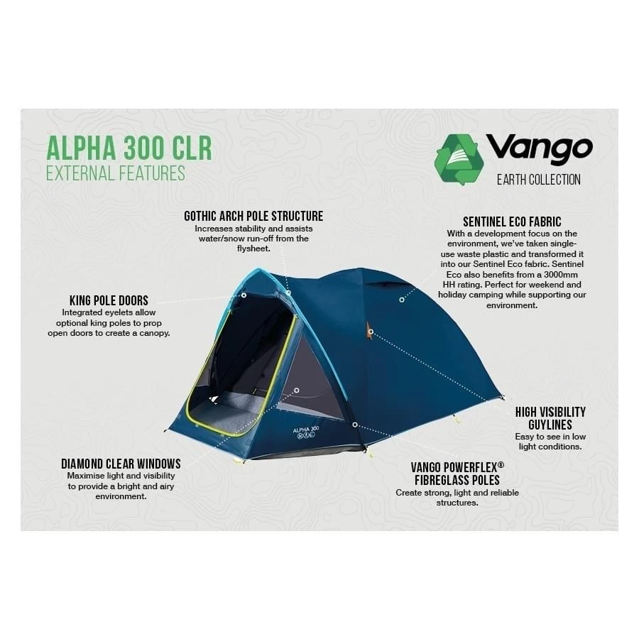 Of je nou met je vrienden, je gezin of gewoon met z’n tweetjes gaat deze Vango Alpha 300 CLR tent biedt ruimte voor 3 personen en daarnaast kun je je bagage nog kwijt in het gedeelte aan de voorzijde van de tent. Met 130 cm in hoogte heb je een ruimtelijk gevoel door de opzet van de Powerflex Fiberglass tentstokken. De zo geheten Gothic Arch Pole Structure zal de regen en zelfs de sneeuw snel van je tent laten afglijden. Vango heeft gebruik gemaakt van Ademend Polyester om vocht geen kans te geven en de buitentent is gemaakt van de waterdichte Sentinel Eco Stof. Hier is onder andere afval plastic in verwerkt en is het gefabriceerd met de focus op het milieu, kwaliteit en duurzaamheid.